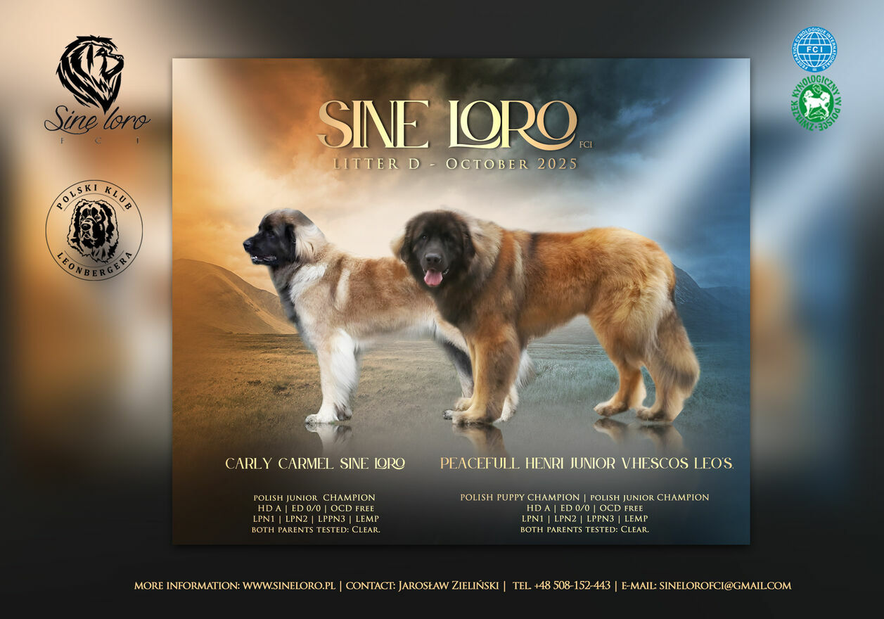 Mamy dostępne szczenięta leonbergerów – suczki. Ojcem jest pies importowany z Holandii, Peacefull Junior Henri Hescos Leo's, a matką suka z naszej własnej hodowli, Curly Carmel Sine loro FCI. Rodzice mają wszystkie wymagane badania zdrowotne, dostępne na naszej stronie internetowej: sineloro.pl. Szczenięta mają 12 tygodni i są gotowe, aby trafić do nowych domów. Są odrobaczone i zaszczepione.Jeśli szukasz wspaniałego, pluszowego misiaka dla całej rodziny, skontaktuj się z nami: @ lub telefonicznie